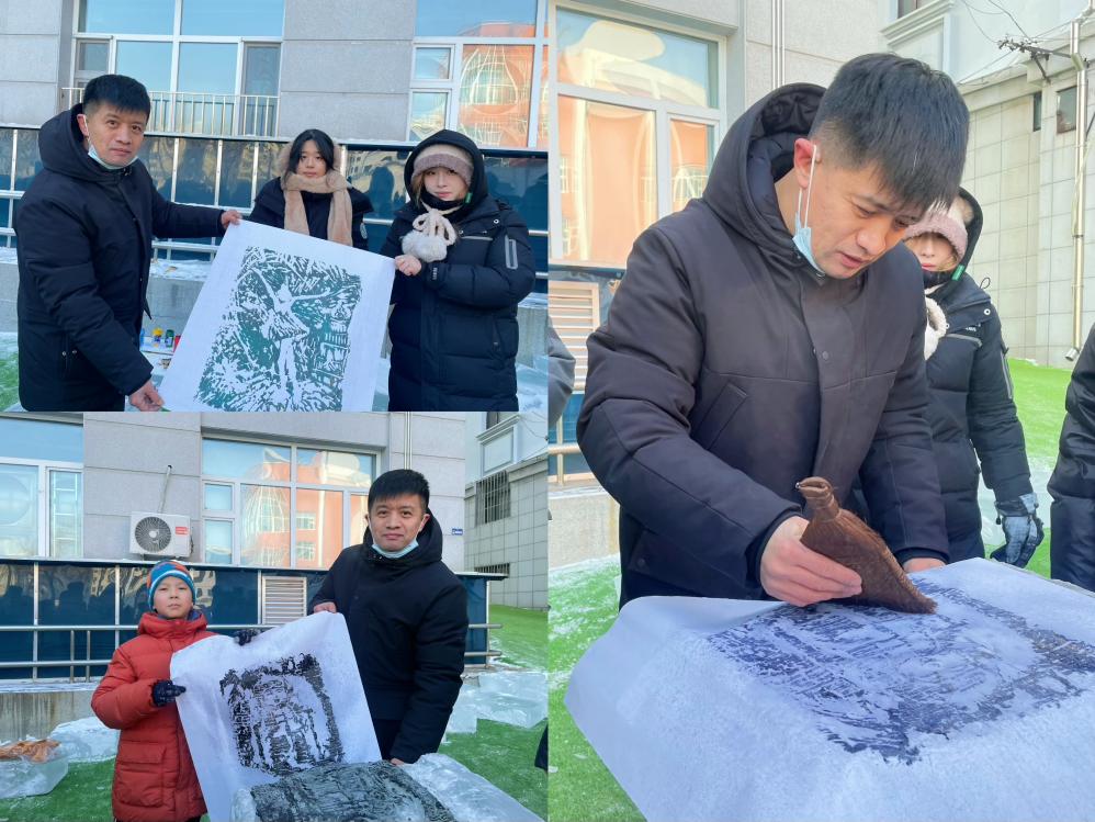 在体验课的室外环节,张存洁老师与8名公司员工亲自带领同学们进行冰版画的制作,在他们的指导下,一幅幅充满创意和灵感的冰版画作品应运而生。