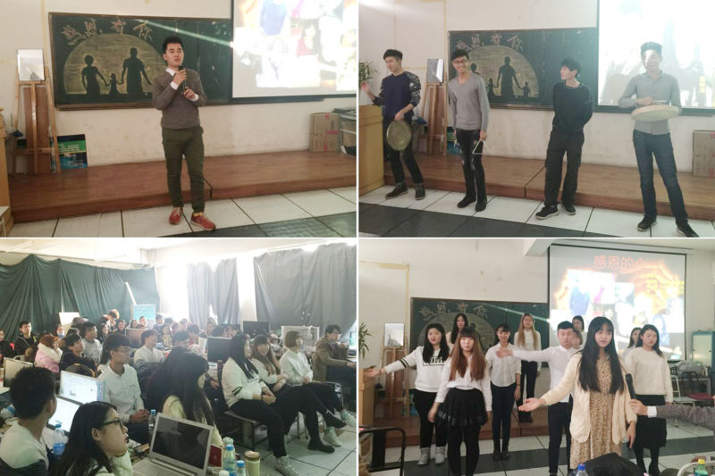 活动以一段漫画视频短片展开,视频播放了一个女孩从小到长大成人及父母从年轻到年迈各阶段的特征,旨在唤醒人们的感恩之心。视频结束后,同学们有感而发,互相分享自己的感想。其中一位同学说到:“生活中的有些事情是不可避免的,有些事是无力改变的,我们只有坦然接受,最重要的是学会感恩,时刻怀有一颗感恩的心”。紧接着,由张宜珏、娄彦亮等四位同学带来精彩表演三句半——《感恩父母》逗乐了全场,也唤起了彼此心中对父母那一份至深的爱。