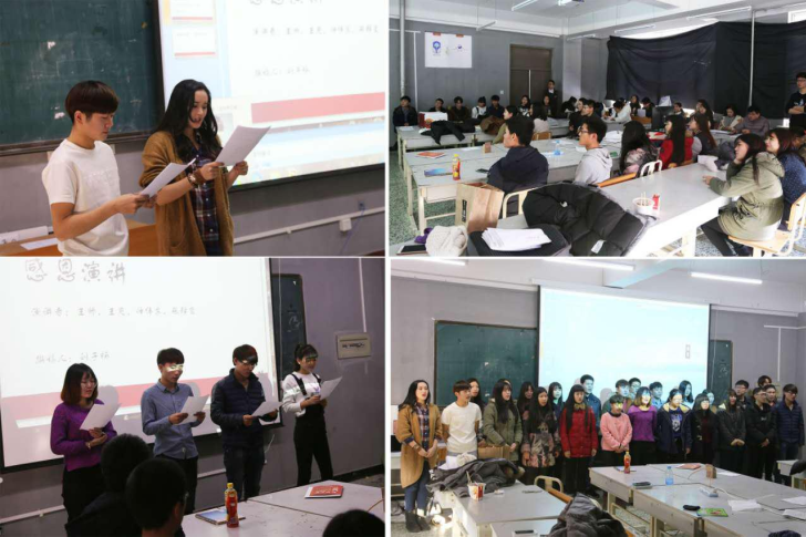 伴随着华丽的开场舞,本次活动正式拉开了序幕。在主持人的隆重介绍下和同学们的热切期待中迎来了第一个主题演讲节目——《感恩》。“我相信,最温暖的日子来自寒冷,我更相信,最温暖其实是对寒冷的一种谅解,一种感恩中的感动。一个人要学会感恩,对生命怀有一颗感恩的心,心才能真正快乐”,几位演讲者抑扬顿挫、声情正茂的演讲,将自身满怀的感恩之心表达的淋漓尽致。团支书朴书良同学发表了对感恩的理解:感恩更是中华民族的传统美德,“饮水思源”的古训家喻户晓,“滴水之恩当以涌泉相报”的思想老少皆知。千古绝唱“谁言寸草心,报得三春晖”,表达了儿女对母亲的恩惠报答不尽的感情,让感恩的思想深深根植于每个华夏子孙的心中。为了活跃现场气氛,大家玩起了击鼓传花,接到花的同学需要给父母打电话说我爱你,感恩父母,是他们给了你生命,是他们呵护着生命成长成枝繁叶茂的大树,无论身在何处,父母的牵挂与叮咛永远在心间长存。