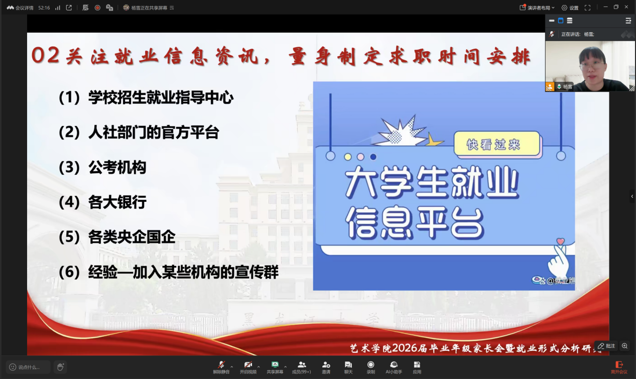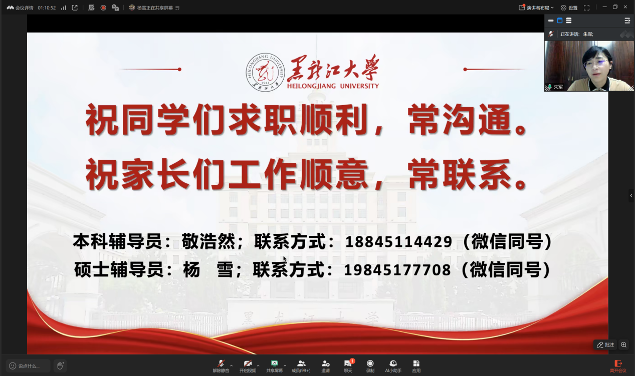 最后,党委副书记朱军老师结合当前就业形势,指出企业用人需求日益多元化,对人才的综合素质、实践能力和创新思维要求不断提升。她鼓励毕业生要顺应趋势,提升核心竞争力,主动适应市场变化,积极参与线上线下招聘活动,灵活把握每一个发展机遇。同时,她呼吁家长主动关注员工的就业动态,与公司保持密切沟通,共同提供科学合理的职业规划支持,凝聚家校合力,打造坚实的就业支持体系,为毕业生的职业发展提供有力保障。